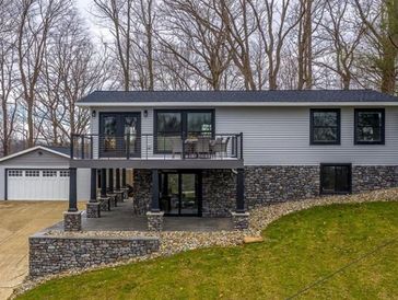 Magnificently remodeled home with two Lake views on two lots. Newer roof, instant hot water tank and high efficiency furnace with smart system control. Newer kitchen cabinets and large island with granite counter tops. Kitchen and Living room feature an open layout with large windows offering beautiful lake views and a gas fireplace. Updated flooring throughout. Bar in family room is perfect for entertaining. Newer custom bunk beds in lower bedroom, each bed has their own reading light and phone charger, perfect for extra guests. Azek decking with Custom Key Link railing for unobstructed views while relaxing outside. Under the deck there is newer custom stamped concrete. The detached garage and covered patio.